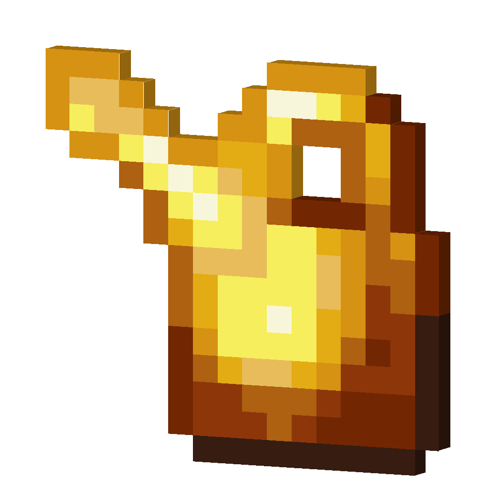A golden watering can is an item that can hold water. It is used to moisture farmland. If full it can moisture farmland 5 times with a moistening area of 9 blocks.